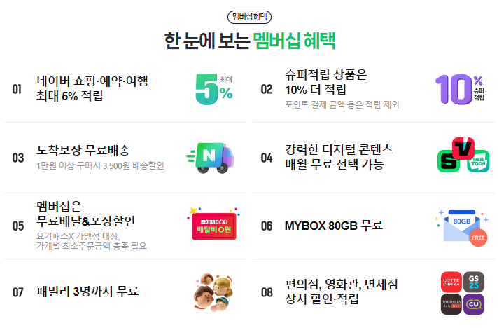 - 디지털 콘텐츠 : 네이버 웹툰, 시리즈 쿠키 등 다양한 디지털 콘텐츠를 무료로 이용할 수 있는 혜택이 있습니다.