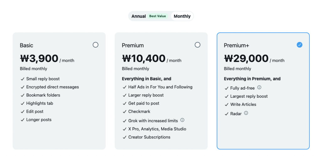 그록3는 다양한 요금제를 제공하여 사용자에게 선택의 폭을 넓혀줍니다. 기본 요금제는 월 3,900원으로, 소규모 응답 부스트와 암호화된 직접 메시지 기능을 포함합니다. 프리미엄 요금제는 월 10,400원으로, 광고가 적고 게시물에 대한 보상을 받을 수 있는 기능이 추가됩니다. 프리미엄+ 요금제는 월 29,000원으로 모든 프리미엄 기능을 포함하며 광고 없이 기사를 작성할 수 있습니다.