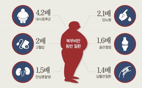 내장지방이 많을 경우, 여러 가지 건강 문제가 발생할 수 있습니다. 예를 들어, 내장지방은 대사 증후군의 위험을 4.2배 증가시키고, 당뇨병의 위험을 2.1배, 고혈압의 위험을 2배 높입니다. 또한 관절 질환, 신장 질환, 심혈관 질환 등 다양한 질병의 위험도 증가합니다. 이러한 위험성을 시각적으로 나타낸 그림을 보면, 내장지방이 건강에 미치는 영향을 한눈에 알 수 있습니다.