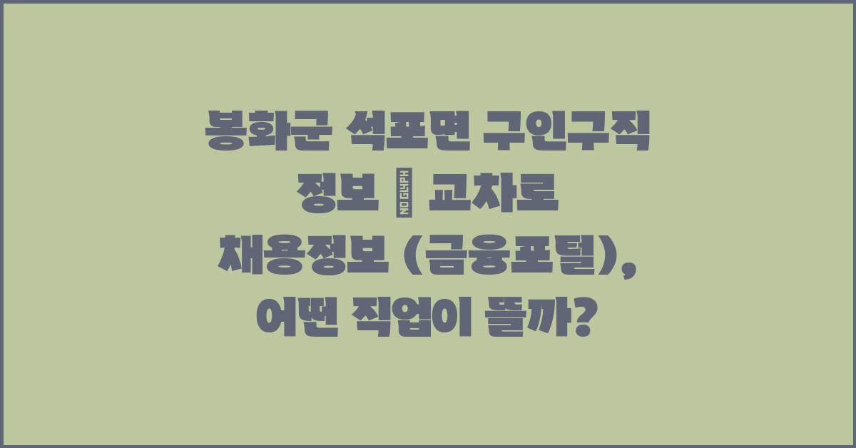 A: 봉화군 석포면 구인구직 정보는 교차로 채용정보 (금융포털)에서 쉽게 확인하실 수 있습니다.
