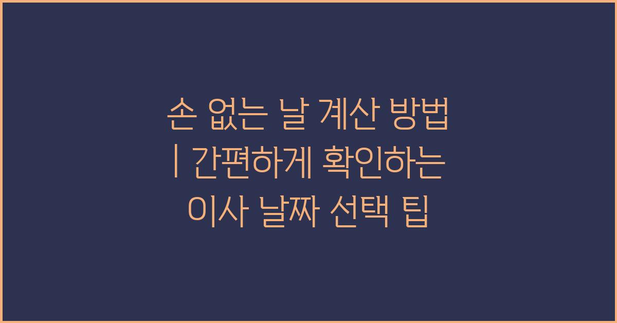 이사를 계획하다 보면 여러 가지 고민이 생기기 마련입니다. 그 중에서도 손 없는 날 계산 방법은 많은 사람들이 가장 신경 쓰는 부분 중 하나가 아닐까 생각합니다. 이사를 할 때 손 없는 날에 맞추면 무탈하게 새로운 집으로 이사할 수 있다는 믿음이 널리 퍼져 있기 때문입니다. 그렇다면 손 없는 날을 어떻게 계산하고 쉽게 확인할 수 있을까요? 오늘은 이사 준비 과정에서 신경 써야 할 손 없는 날 계산 방법과 간편하게 이사 날짜를 선택하는 팁을 소개하고자 합니다.