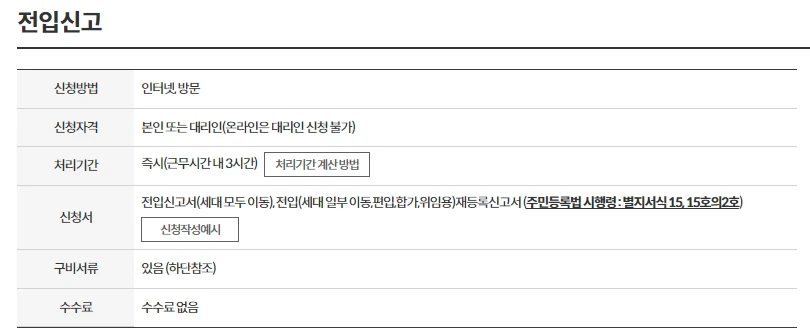 화면에 표시된 전입 신고 양식(아래 첨부)에 따라 필요한 정보를 정확하게 입력합니다. 전입하는 주소, 전입하는 사람의 정보, 전출하는 주소 등을 기입하고, 가족 구성원이 함께 이사하는 경우에는 가족 구성원의 정보도 추가해야 합니다. - 필요 서류 업로드 및 제출