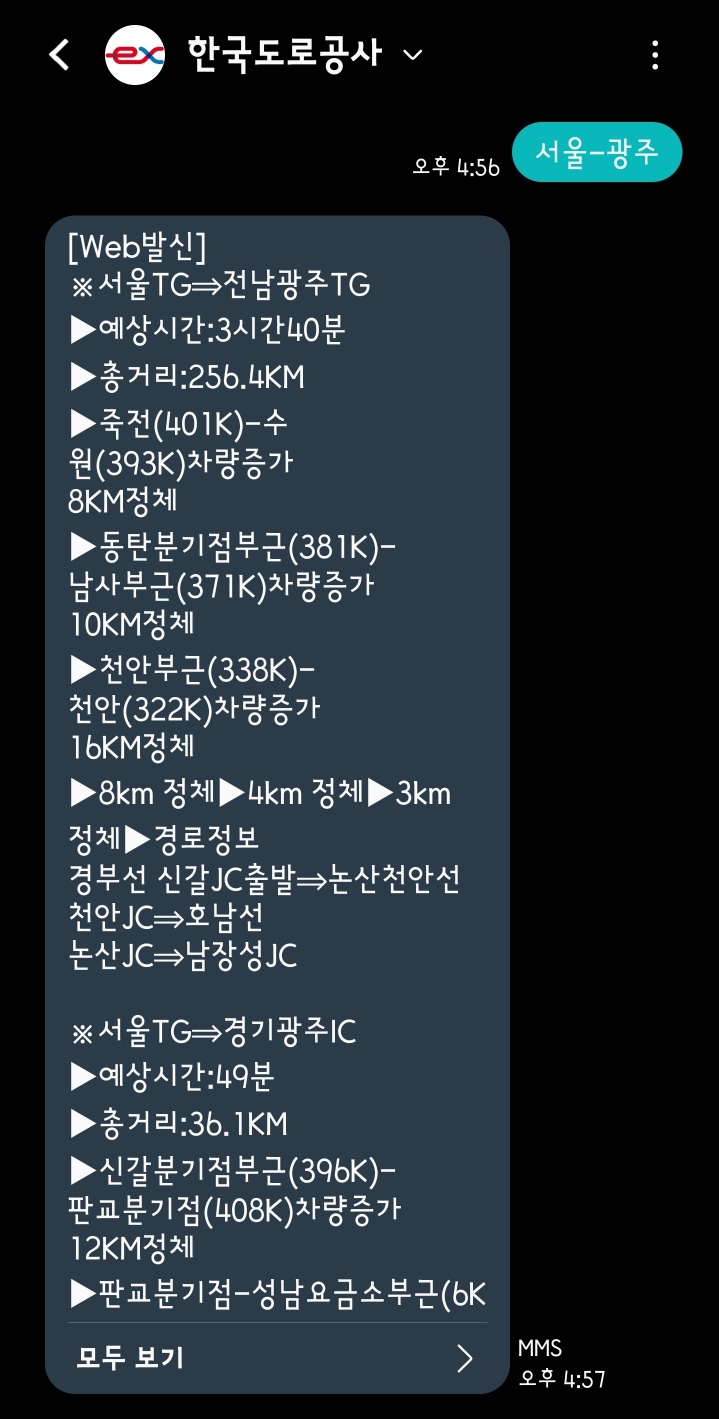 1588-2504로 [출발지-목적지]를 문자로 보내면 예상 시간, 총 거리, 정체 구간까지 1분 만에 알려줍니다.