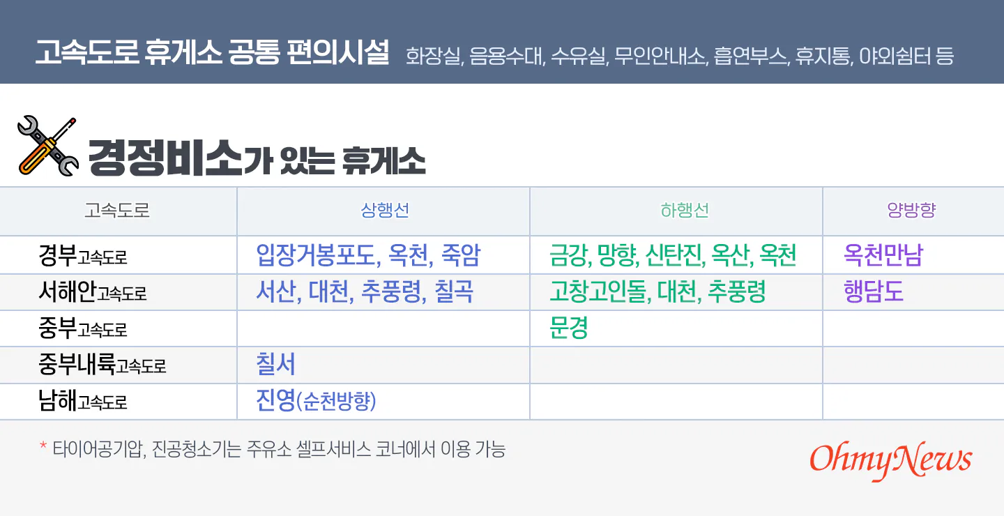 사람뿐만 아니라 자동차도 긴 여정에 지칠 수 있습니다. 경정비가 가능한 휴게소에서 간단한 점검을 받고 안전하게 운전하세요.