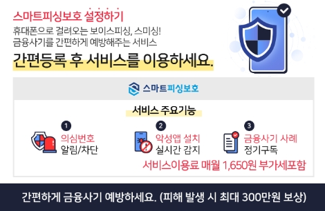스마트피싱보호 서비스는 오늘날 불가피하게 발생할 수 있는 금융사기로부터 여러분과 가족을 안전하게 지켜줄 수 있는 좋은 방법이에요. 이 서비스를 통해 조금 더 안전한 모바일 환경을 만들어보세요. 여러분의 소중한 정보와 재산을 지키는 데 큰 도움이 될 거예요.