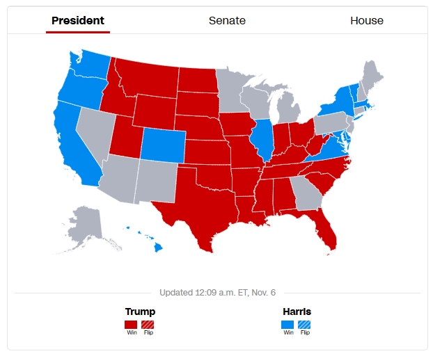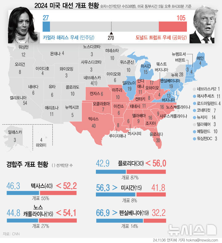 현지시간으로 5일, 미국 전역에서 투표가 진행되고 있으며, 현재 개표 결과가 속속 발표되고 있습니다. 예를 들어, CNN의 데이터에 따르면 해리슨 후보는 27명의 선거인단을 확보한 반면, 트럼프 후보는 105명의 선거인단을 확보한 상태입니다. 각 주별로 개표 현황이 상이하기 때문에, 주목할 만한 경합주인 텍사스, 플로리다, 미시간, 펜실베이니아 등에서의 투표 결과가 어떻게 나오는지가 큰 관심사입니다. 아래 이미지는 현재의 주별 개표 현황을 보여줍니다.