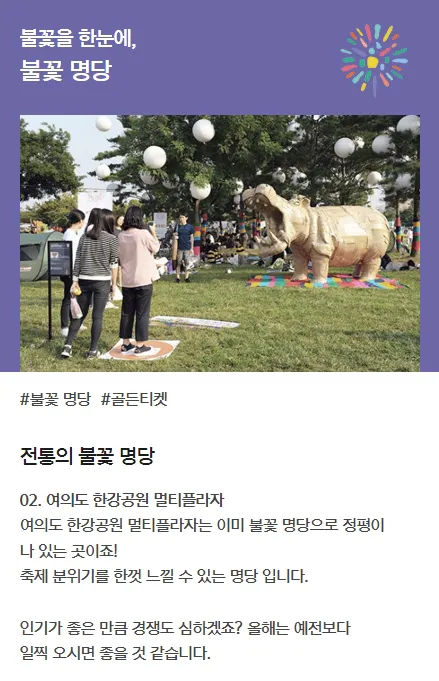 2024년 10월 5일 개최되는 여의도 불꽃축제! 불꽃축제 명당 자리부터 일정, 준비물, 호텔까지 완벽하게 준비하세요. 골든티켓 이벤트 정보와 함께 불꽃축제를 더욱 특별하게 즐기는 꿀팁을 알려드립니다.