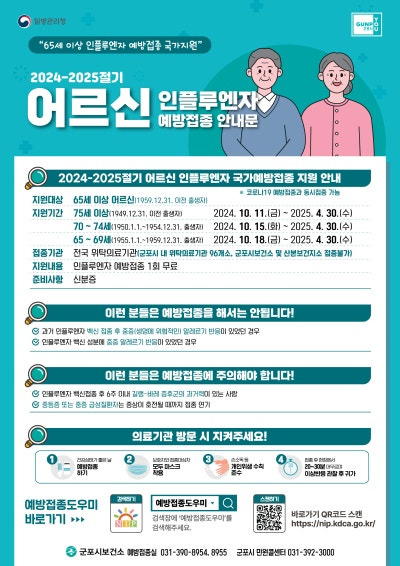 - 65세 이상 어르신, 임신부, 어린이는 무료로 접종 가능합니다.