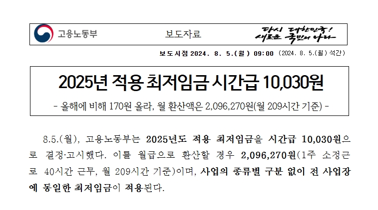 2025년 최저임금은 시간당 10,030원으로 결정되었습니다. 이는 2024년의 최저임금인 9,860원에서 약 1.7% 인상된 수치입니다. 최저임금은 근로자들이 최소한의 생활을 유지할 수 있도록 보장하는 중요한 제도입니다. 따라서, 최저임금의 변화는 많은 사람들에게 직접적인 영향을 미칩니다.
