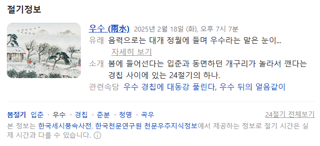 [1] 한국민족문화대백과사전 - 우수(雨水) - 한국민족문화대백과사전 (https://encykorea.aks.ac.kr/Article/E0039984)